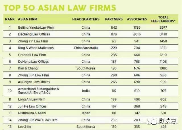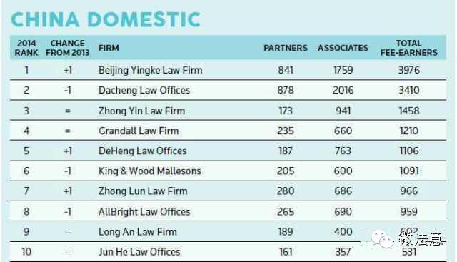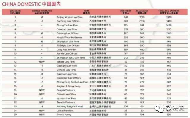 素有法律界“福布斯”之称的《亚洲法律事务》(ALB)杂志每年都要对全球和亚洲及经济热点国家、地区的律师事务所进行权威排名。近日,《亚洲法律杂志》(ALB中国版)杂志公布了2014年中国内地律师事务所规模最新排名,本次排名按照律师人数规模进行统计评选。前25位如下: